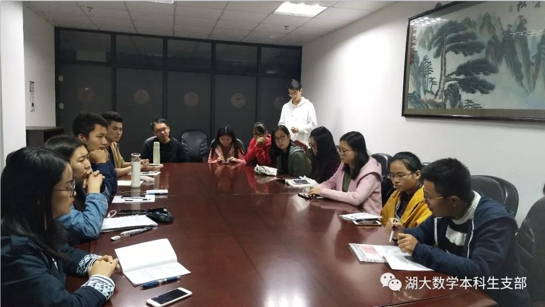 2018年10月14日,数学院本科生党支部书记魏书芳同志和张路鹏同志组织数学院发展对象在数学院院楼326开展了关于“共产党员的责任与担当”专题讨论活动,此次活动旨在增进各位发展对象对十九大精神的认识以及新形势下党内生活的若干准则,提高发展对象的思想觉悟和政治觉悟。