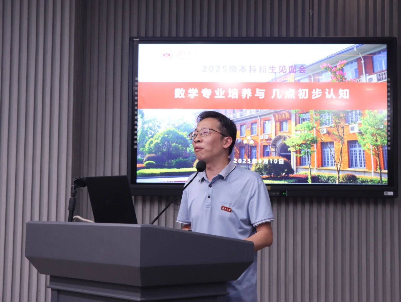 雷渊老师依次围绕数学专业培养方案、对大学的初步认知、对数学的初步认知三个方面展开分享,并首先从学院培养方案的解读入手,针对学科与专业、课程类型及学分要求、转专业及保研相关政策等方面作详细描述:“我们既重视‘数学分析’‘高等代数’等基础课程的扎实性,确保新生掌握核心理论;也为学有余力的学生提供‘拔尖人才培养计划’,通过科研启蒙、竞赛培训等,助力他们向更高层次发展,实现‘基础保底、个性拔高’的培养目标。”以此引导学生根据培养方案合理地规划自己的大学学习生活。随后,雷渊老师阐释数学学科的特点和不同的学习方向,勉励各位新生尽快适应大学的学习节奏,做会学习、能思考、勤交流、有担当的数院人。