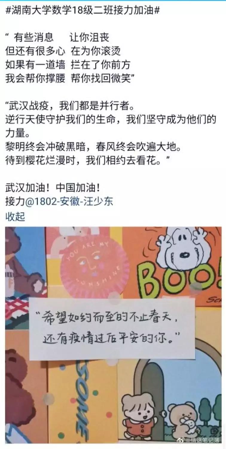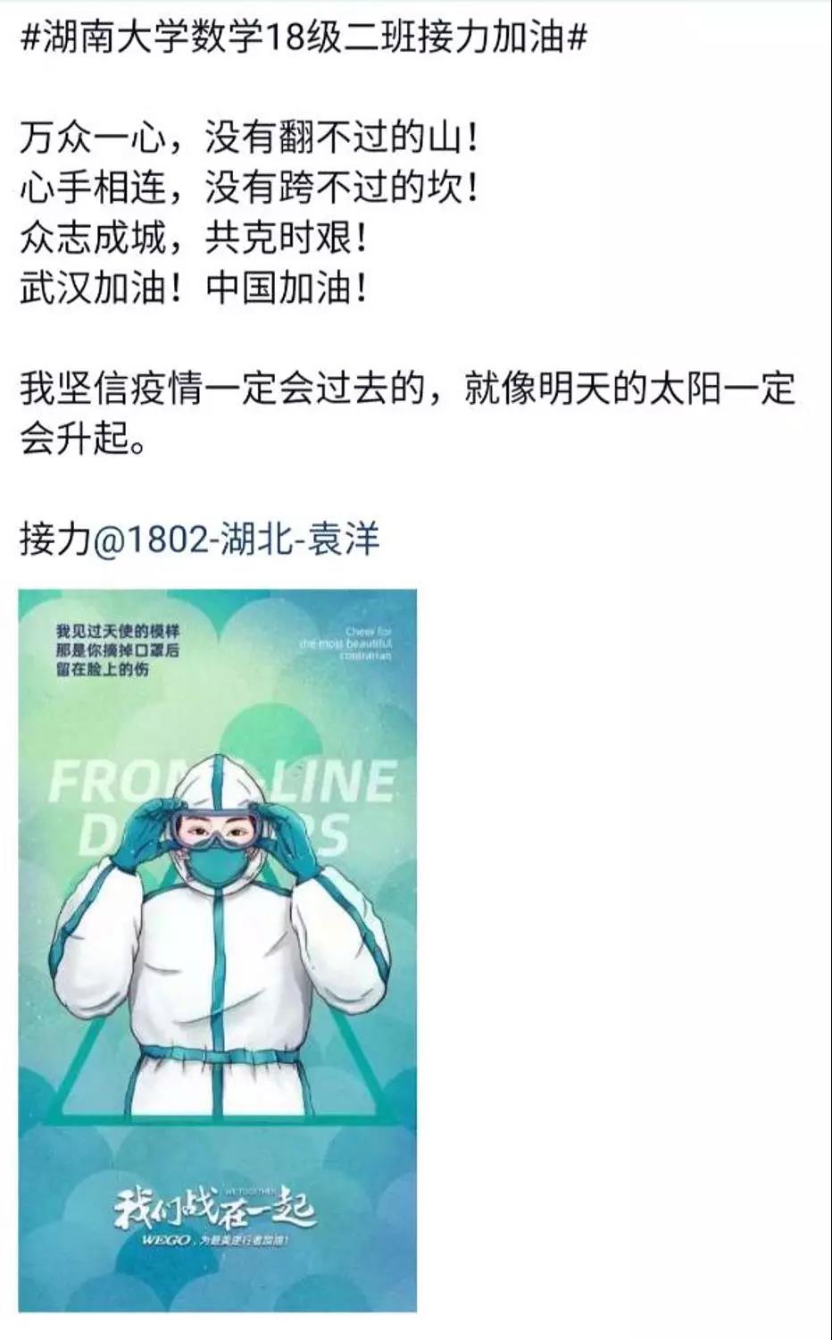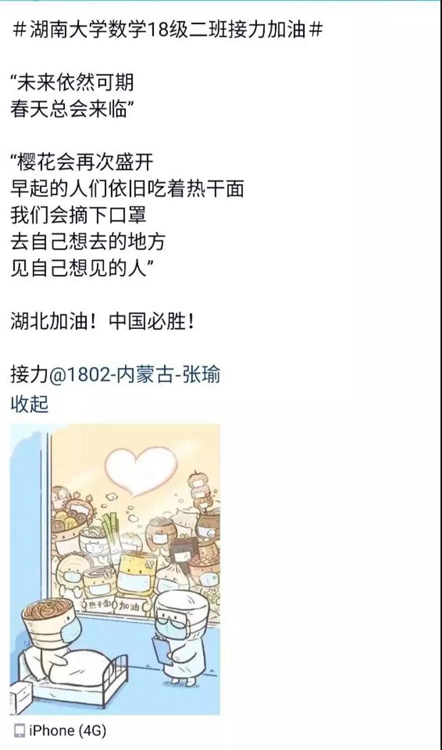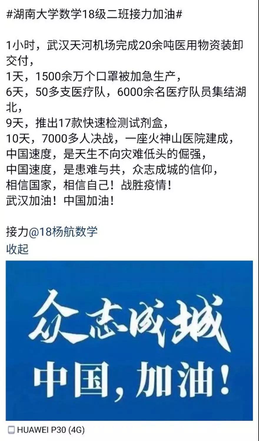 近日,taptap点点体育数学院1802班的同学们自发组织了一场线上“接力加油“活动,为中国祈福,为武汉加油!
